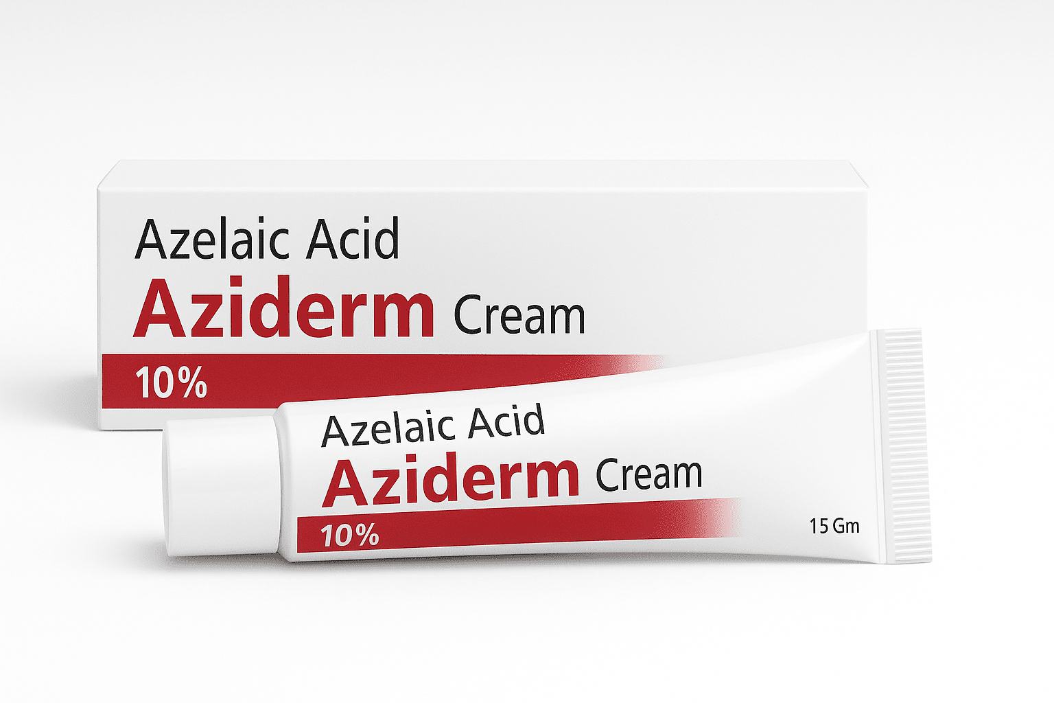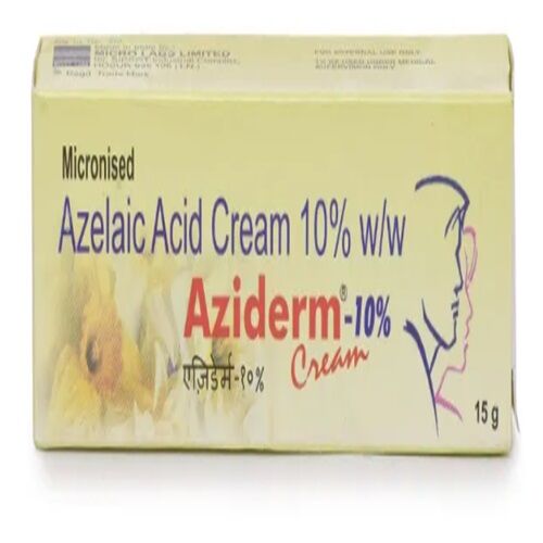 Aziderm Cream 10% (15 Gm) is a topical medication used for the treatment of acne (pimples) and other skin conditions caused by bacterial infections. It contains Azelaic Acid as its active ingredient, which helps reduce inflammation, unclog pores, and prevent the growth of acne-causing bacteria. This cream also helps in reducing dark spots, hyperpigmentation, and skin redness, making the skin appear clearer and smoother.