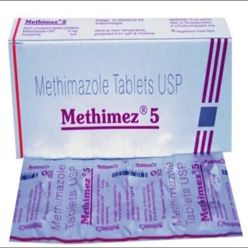 Methimez 5mg is an antithyroid medication used to treat hyperthyroidism (overactive thyroid gland) by reducing the excessive production of thyroid hormones. It is commonly prescribed to manage symptoms such as rapid heartbeat, sweating, and nervousness associated with hyperthyroidism. Methimez contains Methimazole, a potent active ingredient that helps restore hormonal balance and improves thyroid function.